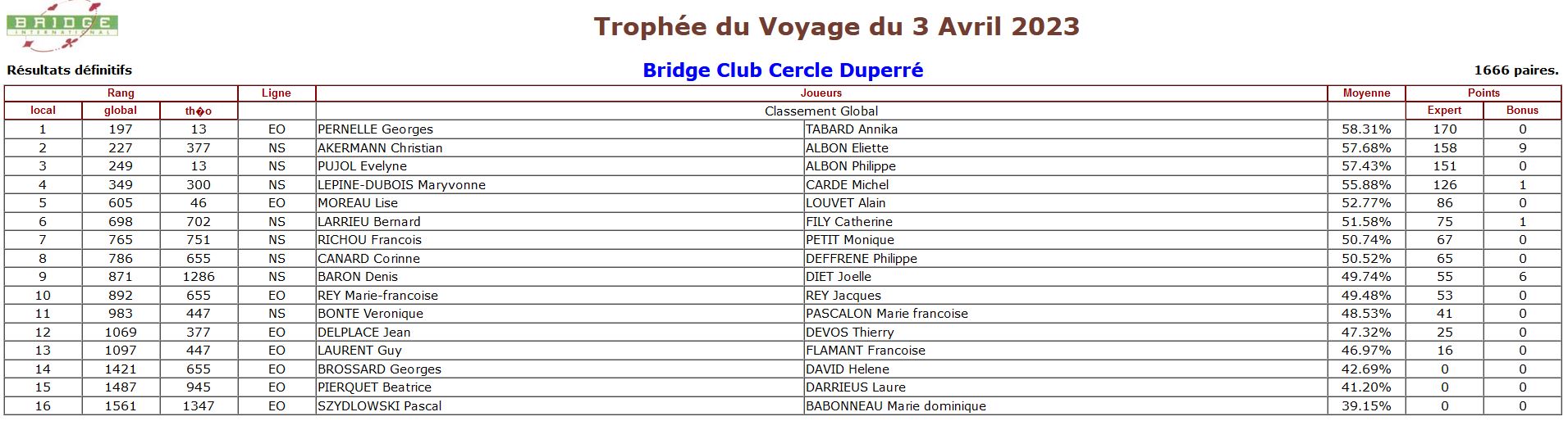 Tous les participants au Trophée du Voyage sont classés sur la régularité annuelle. Les meilleurs de chaque série sont qualifiés pour la prestigieuse Finale des Masters de Bridge International.