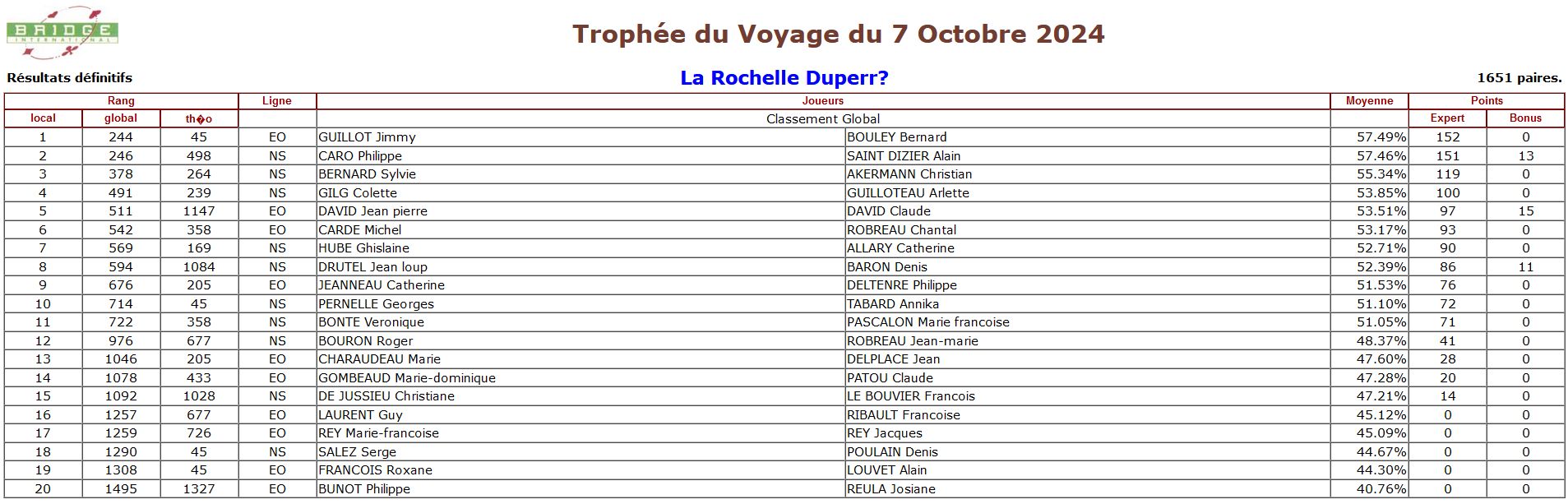 Tous les participants au Trophée du Voyage sont classés sur la régularité annuelle. 60 joueurs sont qualifiés pour la prestigieuse Finale des Masters de Bridge International.
