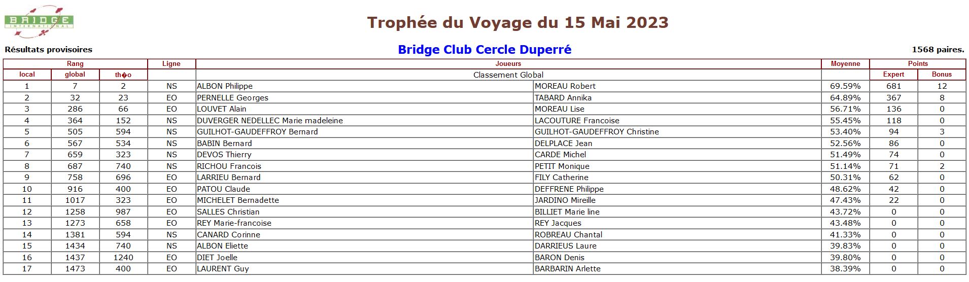 Tous les participants au Trophée du Voyage sont classés sur la régularité annuelle. Les meilleurs de chaque série sont qualifiés pour la prestigieuse Finale des Masters de Bridge International.