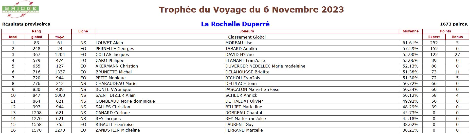 Tous les participants au Trophée du Voyage sont classés sur la régularité annuelle. 60 joueurs sont qualifiés pour la prestigieuse Finale des Masters de Bridge International.