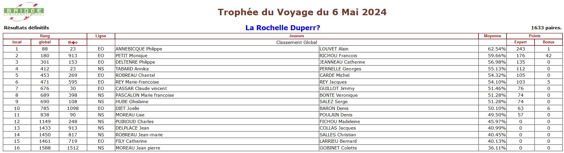 Tous les participants au Trophée du Voyage sont classés sur la régularité annuelle. 60 joueurs sont qualifiés pour la prestigieuse Finale des Masters de Bridge International.