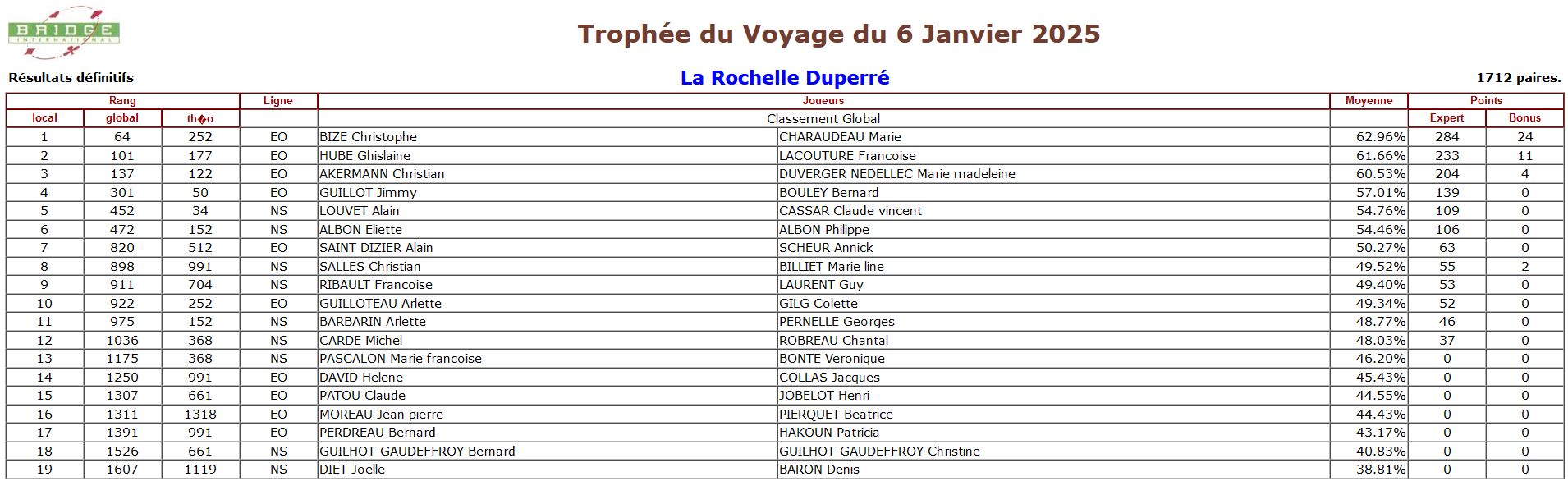 Tous les participants au Trophée du Voyage sont classés sur la régularité annuelle. 60 joueurs sont qualifiés pour la prestigieuse Finale des Masters de Bridge International.