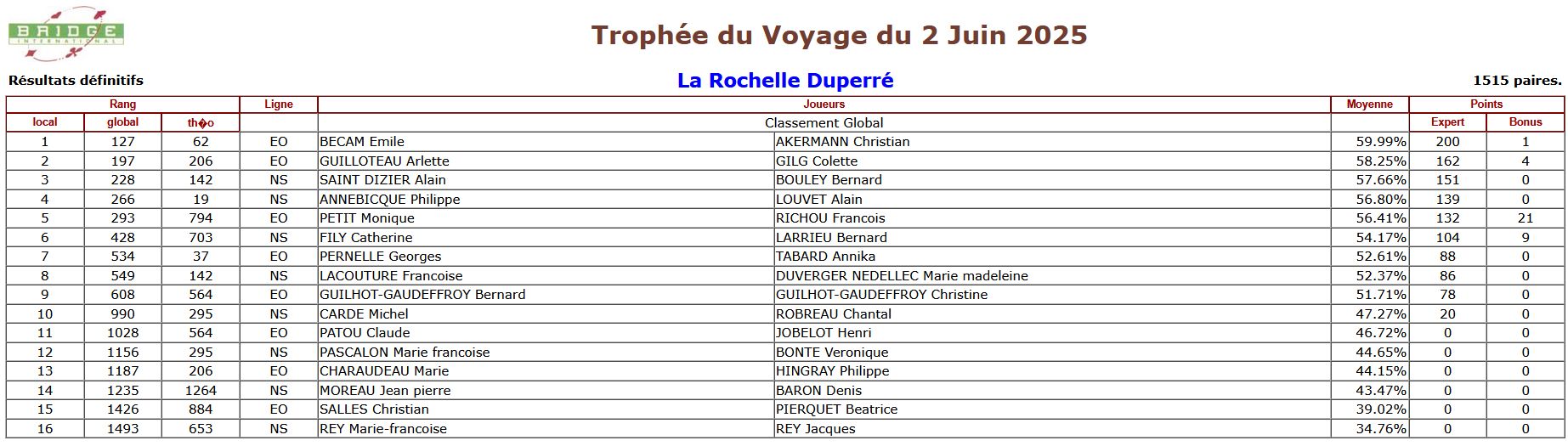 Tous les participants au Trophée du Voyage sont classés sur la régularité annuelle. 60 joueurs sont qualifiés pour la prestigieuse Finale des Masters de Bridge International.
