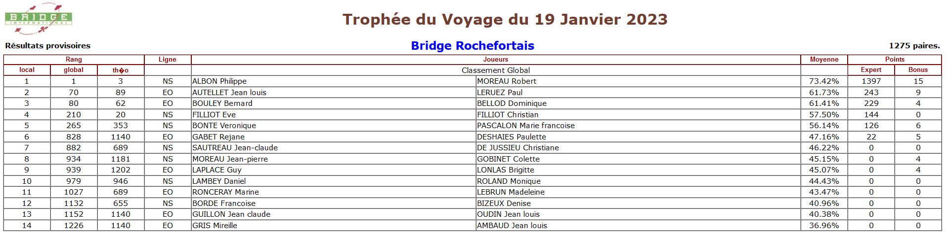 Avec la moyenne plutôt élevée de 73,42%, Robert Moreau et Philippe Albon profitent du court déplacement à Rochefort pour terminer 1ers nationaux sur 1275 paires et repartent avec les bonnes bouteilles qui vont avec.